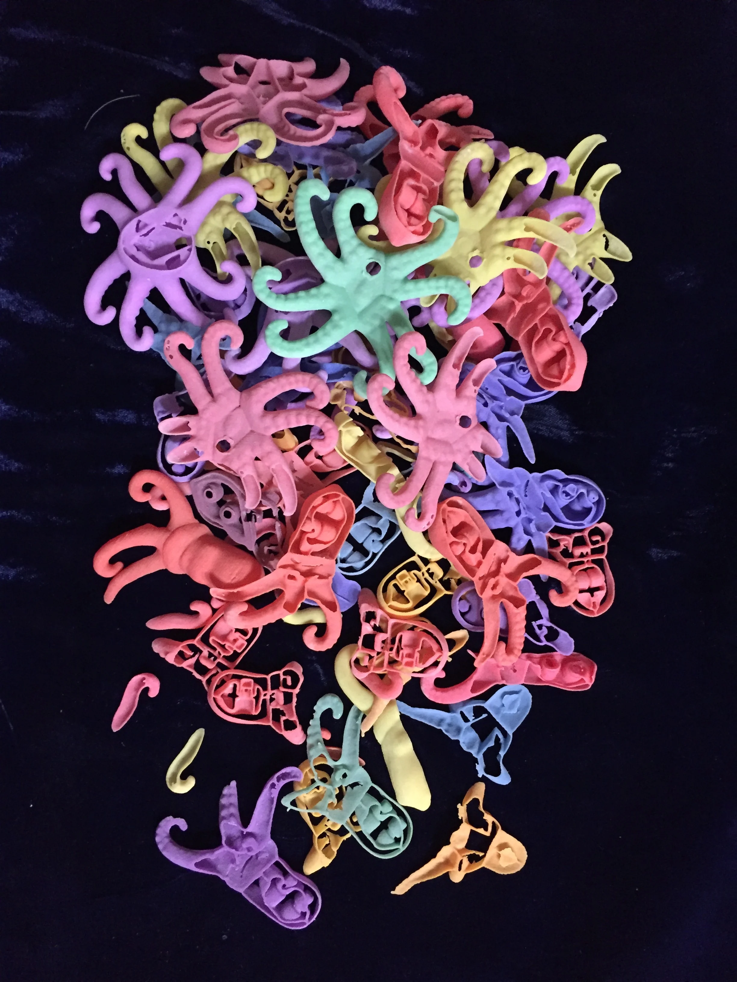 Seccombe has employed 3D ink-jet printing technologies to replicate the plastic octopus in modified forms. Since scanning of the toy octopus in 2006, the artist has considered the ubiquitous pollution of plastic debris throughout the marine environment. As plastic rubbish disintegrates into smaller and smaller particles, scientists are identifying trillions of minute objects entering the ocean food chain and seriously damaging ocean habitats. As plastic is rapidly replacing marine life, Seccombe is considering through 3D printing processes, how plastic based species will evolve out of this toxic sea of resin.