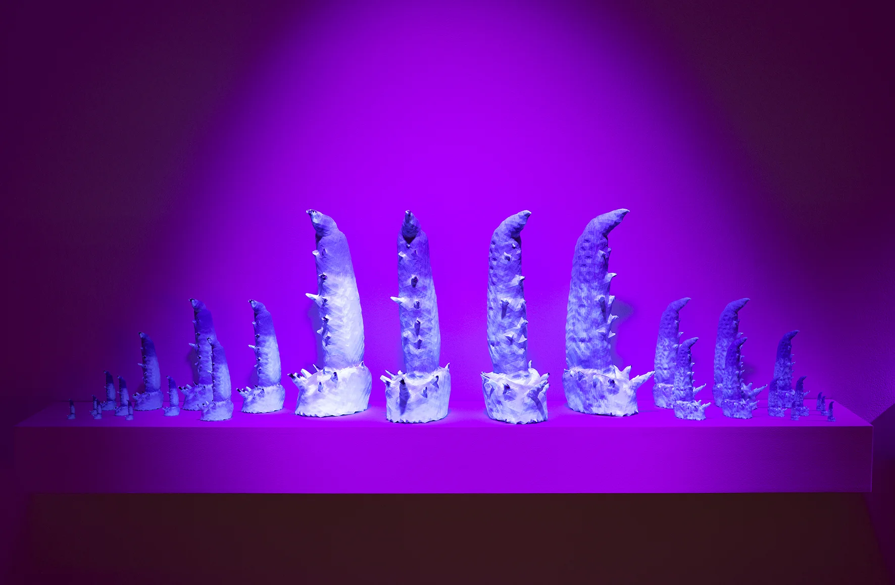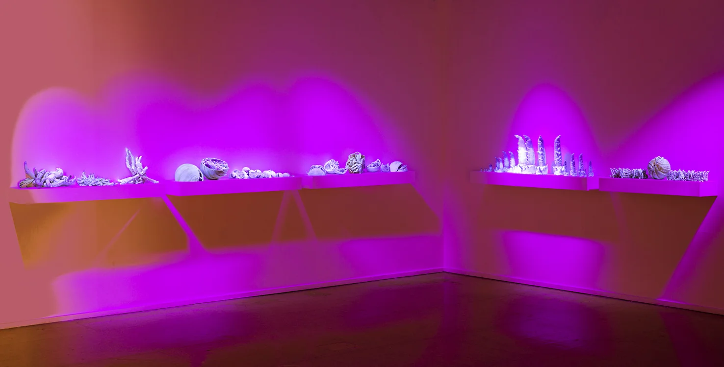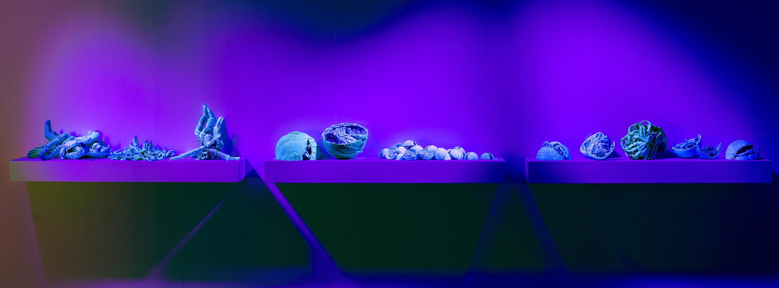 For this work I created a number of 3D printed objects exploring various components of a virtual isopod, such as its legs, internal spaces and carapace. During the printing process I intuitively reasoned that the ink might be fluorescent under a UV light. Testing a range of colours, I discovered that the binder in the inks created a luminescent glow which was increased when used purple ink. To enhance this effect in the gallery space I installed six LED UV lights to project onto the objects arranged on five wall-mounted shelves. Under the UV light the printed works emitted a violet glow, reminiscent of blacklight, or light emitting diodes used in scientific experiments to capture information not normally visible to the human eye. I entitled this series of printed objects Modern Prometheus (after Shelley), a reference to the mythological story of humans giving life to something dead.
