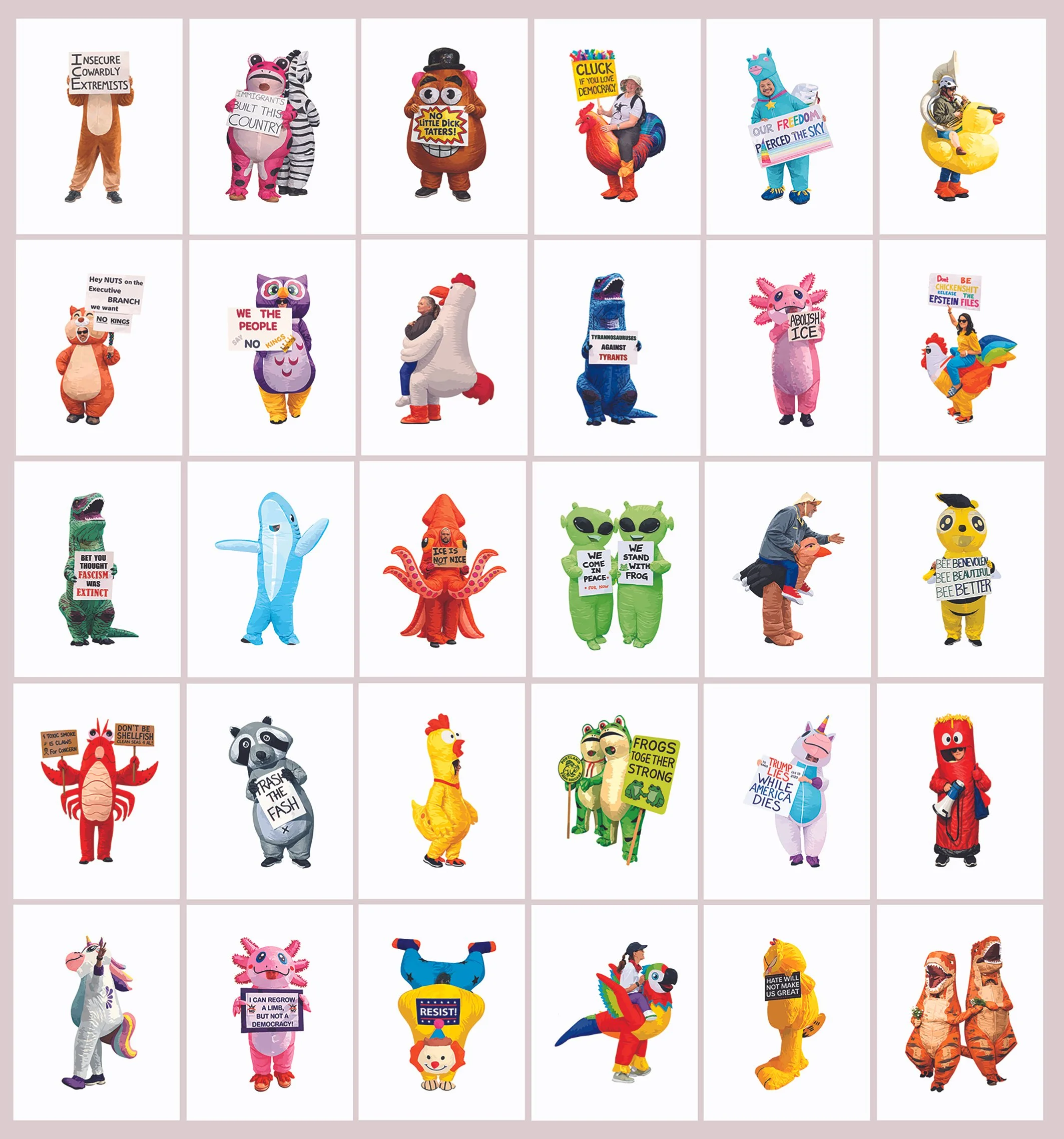 "Operation Inflation” is a series of 30 inkjet prints that draws on the history of poster art and protest graphics. Inspired by the inflatable spectacle of the American No Kings demonstrations, I have recreated images that circulated on social media and news outlets. This work explores the subversive use of humour within protest culture opposing authoritarianism and anti-immigration rhetoric. Protesters risk their lives and face armed troops with satire and absurdity, transforming public space into a platform for collective critique, where laughter serves as a form of resistance. The works highlight how visual language spreads quickly through protest movements, transitioning between street, screen, and print. Although rooted in imagery from demonstrations in the USA, the issues this work addresses, such as rising xenophobia and the decline of democratic values, resonate well beyond national borders and suggest that the tensions driving these protests are increasingly global, affecting all our lives.